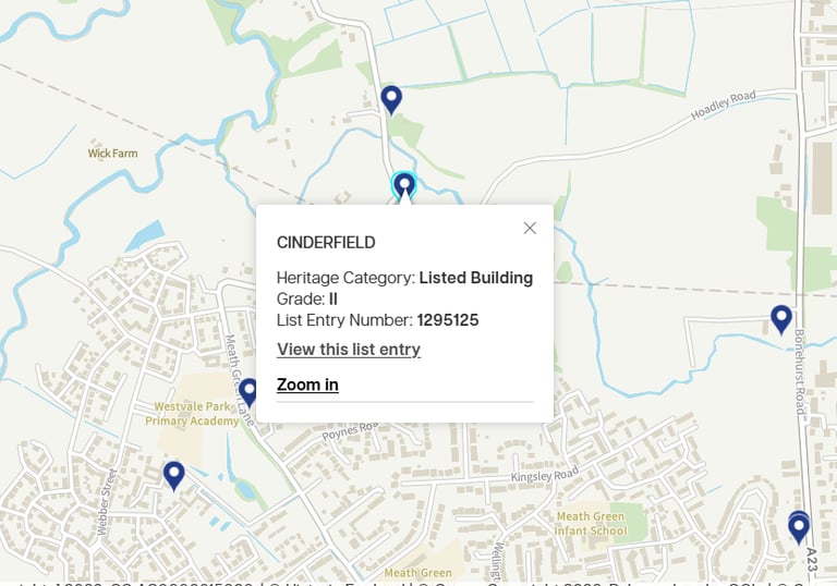 Cinderfield: Grade II building is listed under the Planning (Listed Buildings and Conservation Areas) Act 1990 as amended for its special architectural or historic interest.